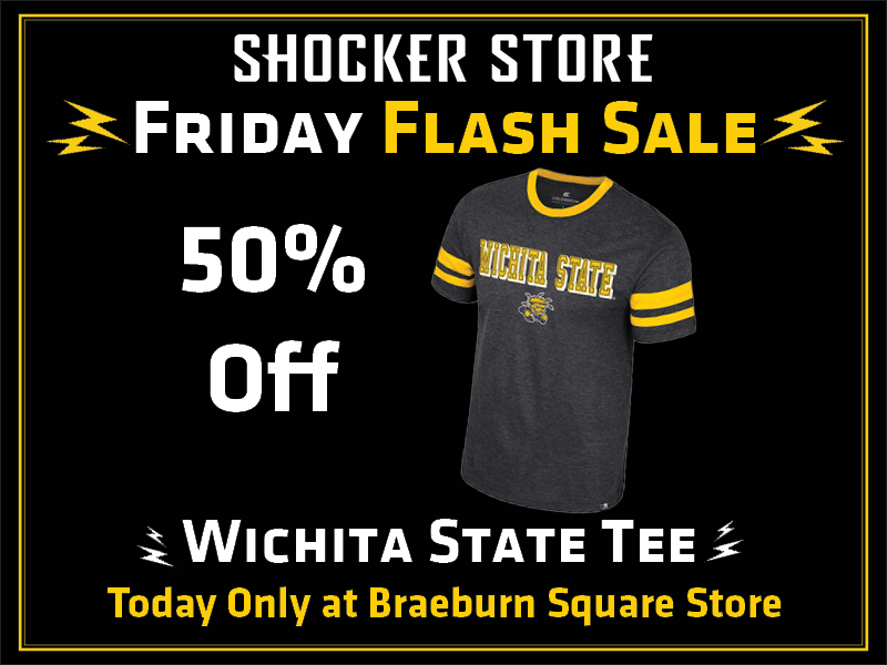 Visit the Braeburn Square Shocker Store today for a Friday Flash Sale and save 50% on a select Wichita State T-shirts, making it just $13.50! Not valid with other discounts or promotions. Store hours are 11 a.m.-7 p.m.